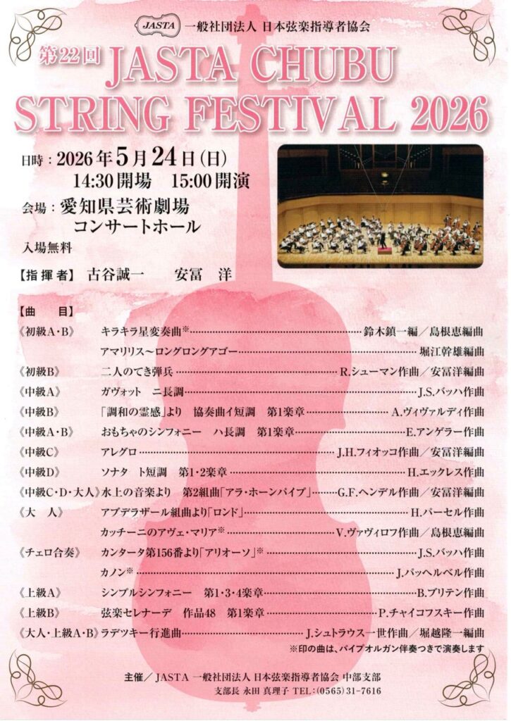 13:00開場、13:30漆原啓子先生のトークとミニコンサート、14:00公開レッスン、17:30先生とJASTA会員の座談会。